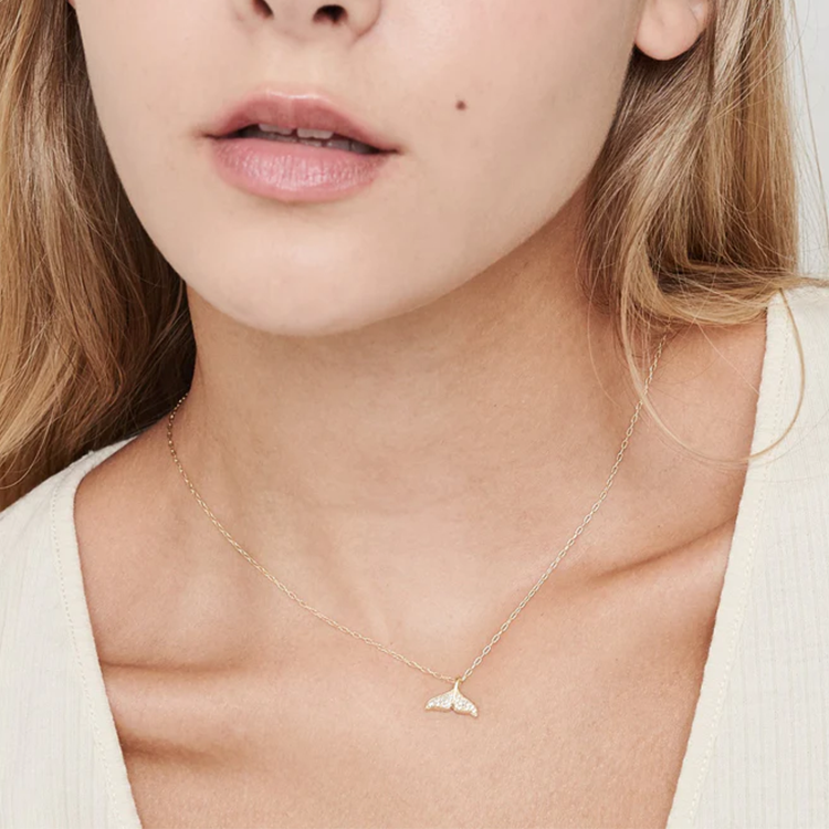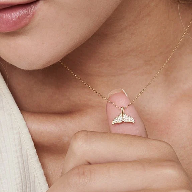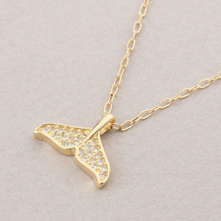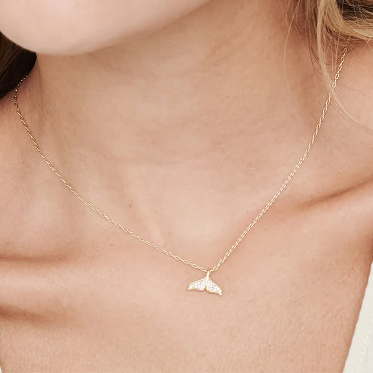 A 14K gold-filled mermaid tail necklace with sparkling cubic zirconia — durable, fade-resistant, and inspired by ocean elegance.