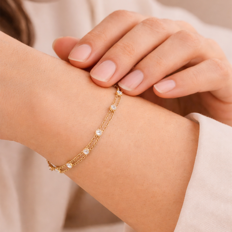 Each strand is accented with small sparkling stones (approximately 3–4 mm) that add just the right amount of shimmer while maintaining a sleek, minimal profile. The strands connect at a single clasp, ensuring the bracelet sits comfortably and neatly on the wrist without tangling.
