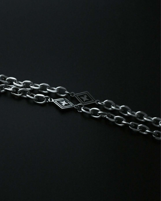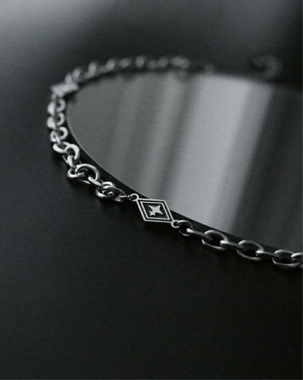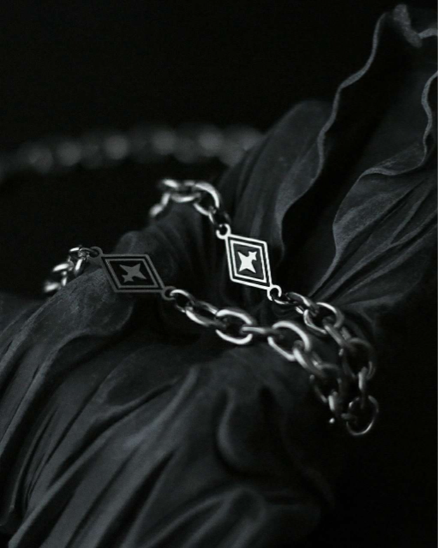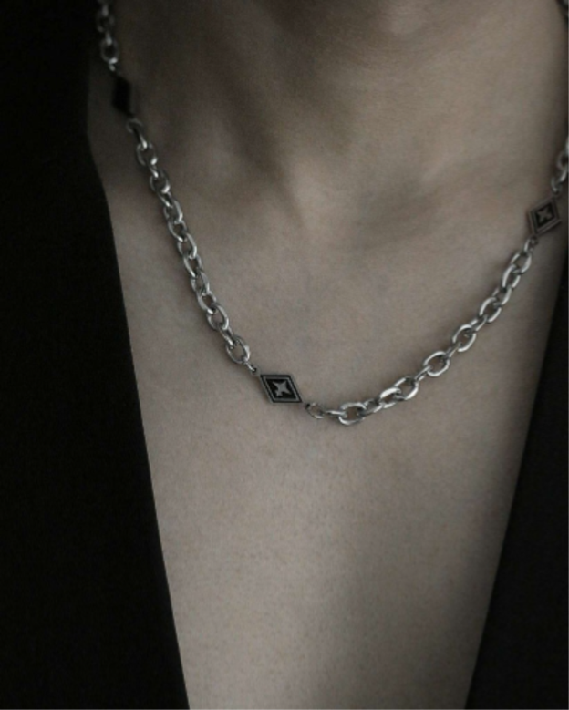 Constructed from surgical-grade 316L stainless steel and finished to sterling silver standards, it features black diamond-inspired detailing that adds a sharp, masculine edge. At a versatile 45 cm length, it sits comfortably at the collarbone. Waterproof, hypoallergenic, and tarnish-resistant, it’s a durable essential built for the modern gothic wardrobe.