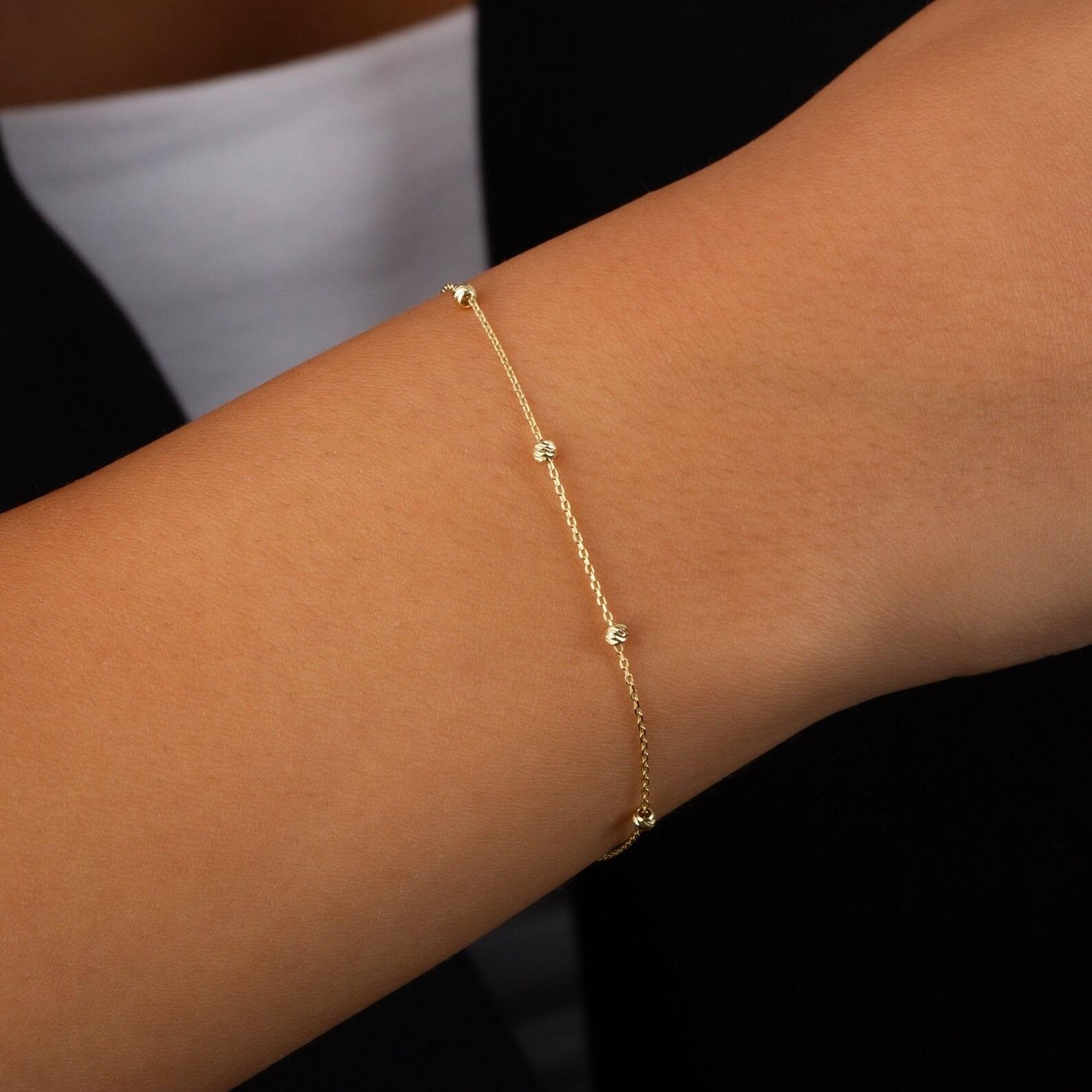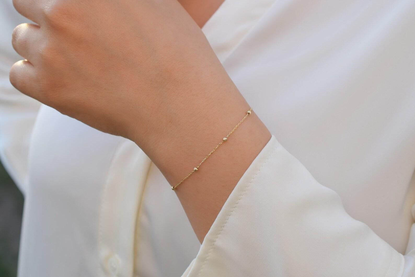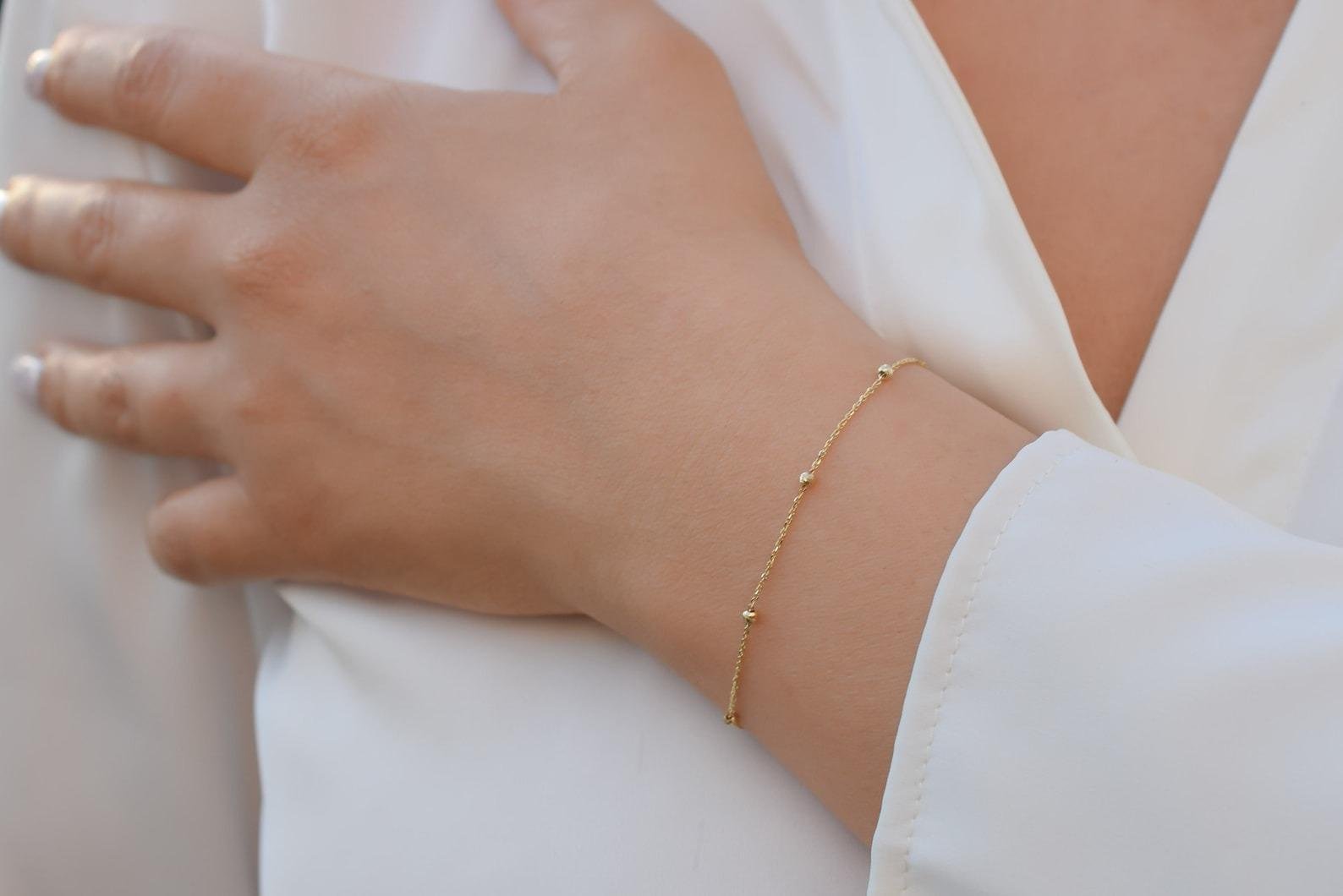 The design features a delicate 1 mm chain punctuated by perfectly polished 3 mm gold spheres, adding subtle texture and brilliant light reflection to your wrist. Engineered for security and comfort, it features a unique anchor closure and an adjustable length to ensure a bespoke fit. Whether styled as a clean solo statement or layered with other fine pieces, it transitions seamlessly from daytime poise to evening elegance.