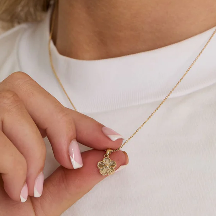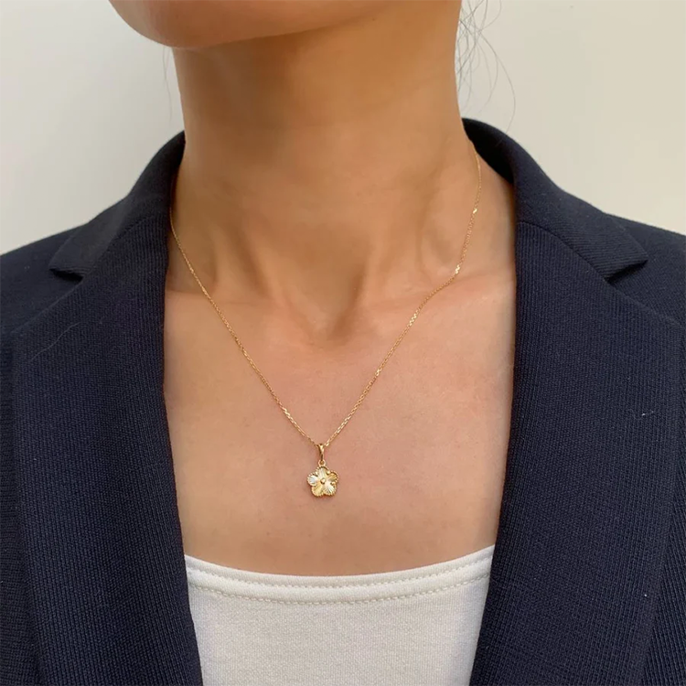 The refined 1mm gold chain sits gracefully at 45cm (17.7″), with an adjustable option to wear at 42cm (16.5″), allowing for versatile styling and perfect layering. The petite yet eye-catching flower pendant measures 13.5mm in total height with a 9.5mm diameter, making it ideal for everyday luxury.